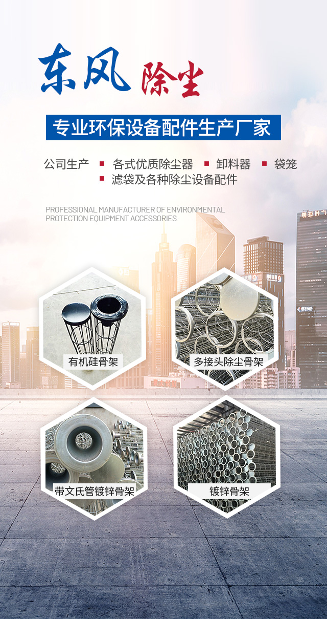 東風產(chǎn)品 品質(zhì)保證主要產(chǎn)品: 骨架﹙袋籠﹚ / 濾 袋 / 卸料器﹙卸灰閥﹚ / 除塵器 / 除塵設(shè)備配件